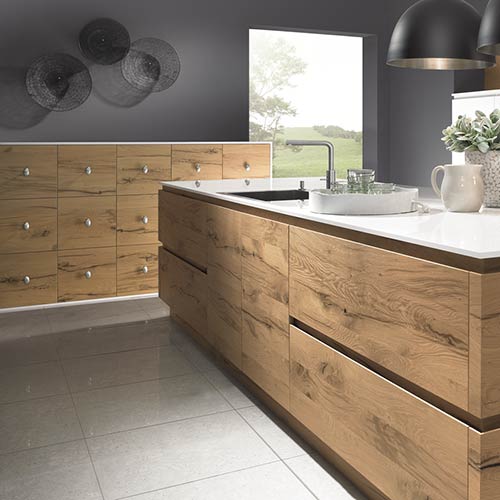 In unserer Premium Kollektion der Landhausküchen bieten wir unter anderem unsere Oak-Line Edition mit handwerklich angefertigten Holzfronten und Accessoires an.